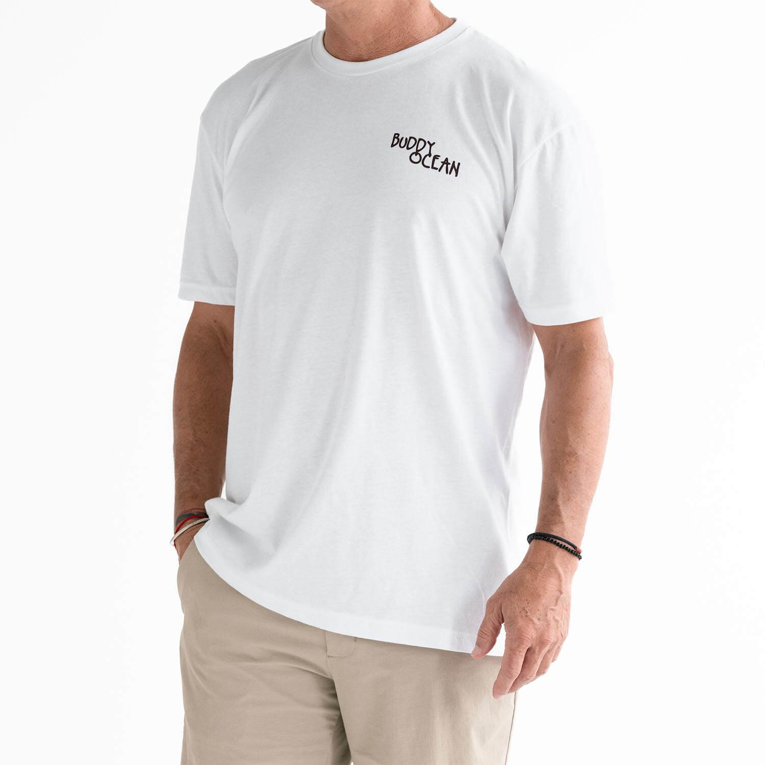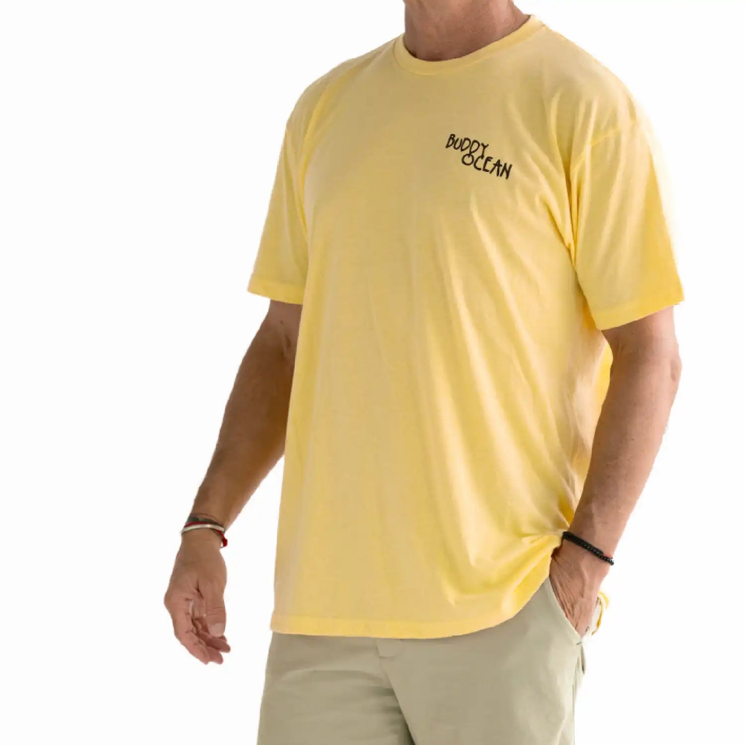 60/40 Combed ring spun cotton/poly. If you're between a large and XL, get the XL, studio Model is 6ft 185lbs wearing an XL