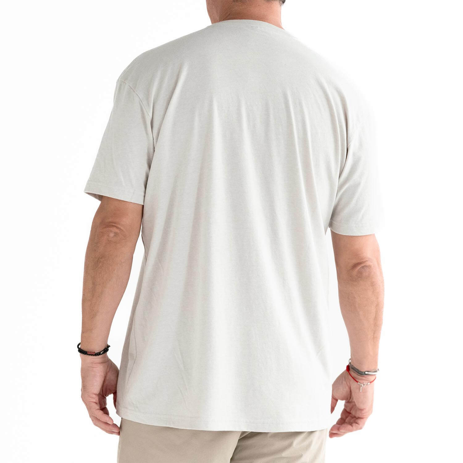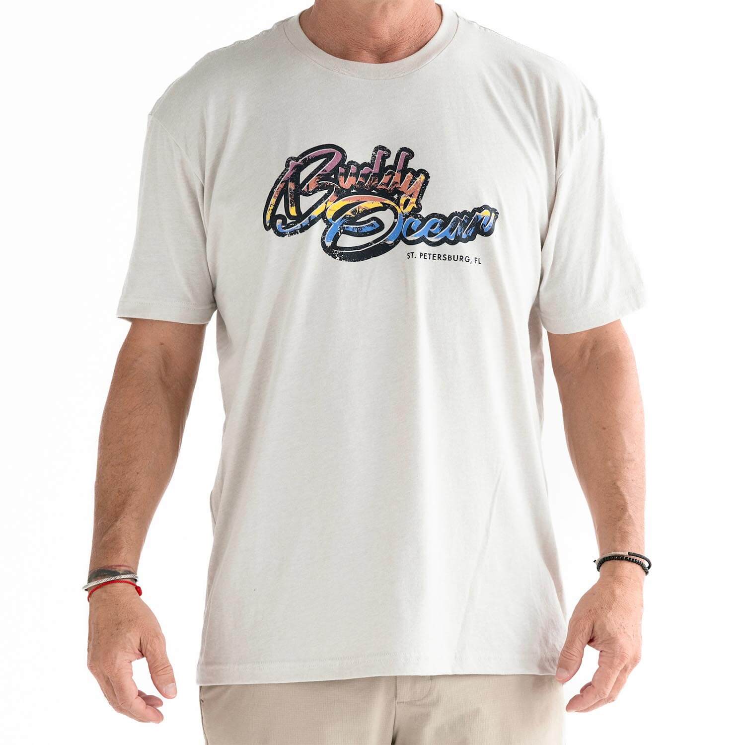 60/40 Combed ring spun cotton/poly. If you're between a large and XL, get the XL, studio Model is 6ft 185lbs wearing an XL