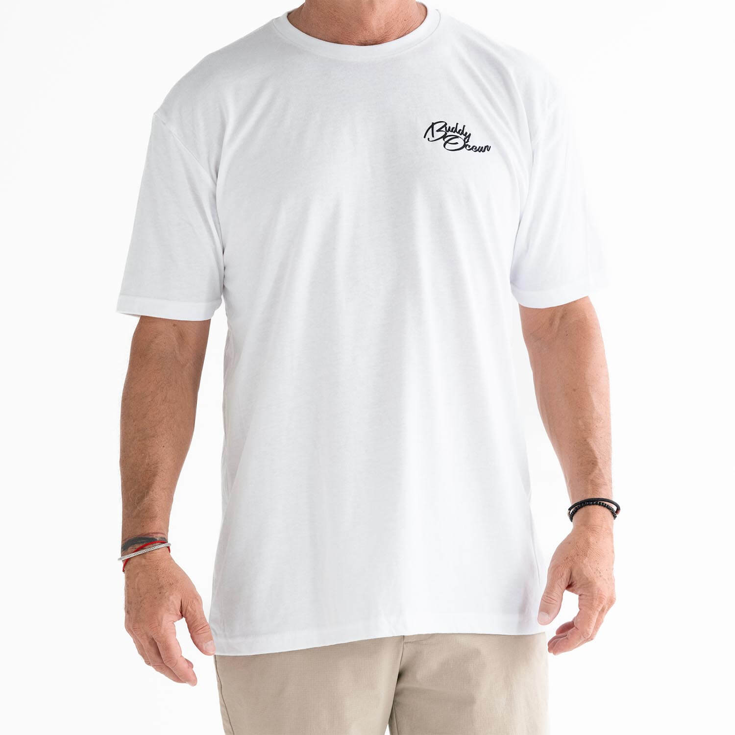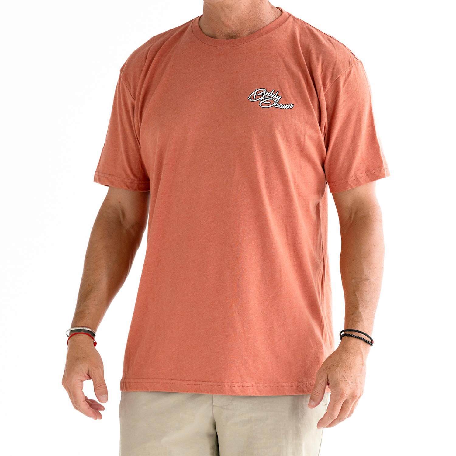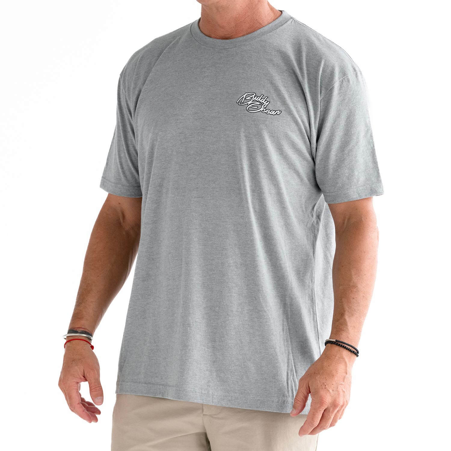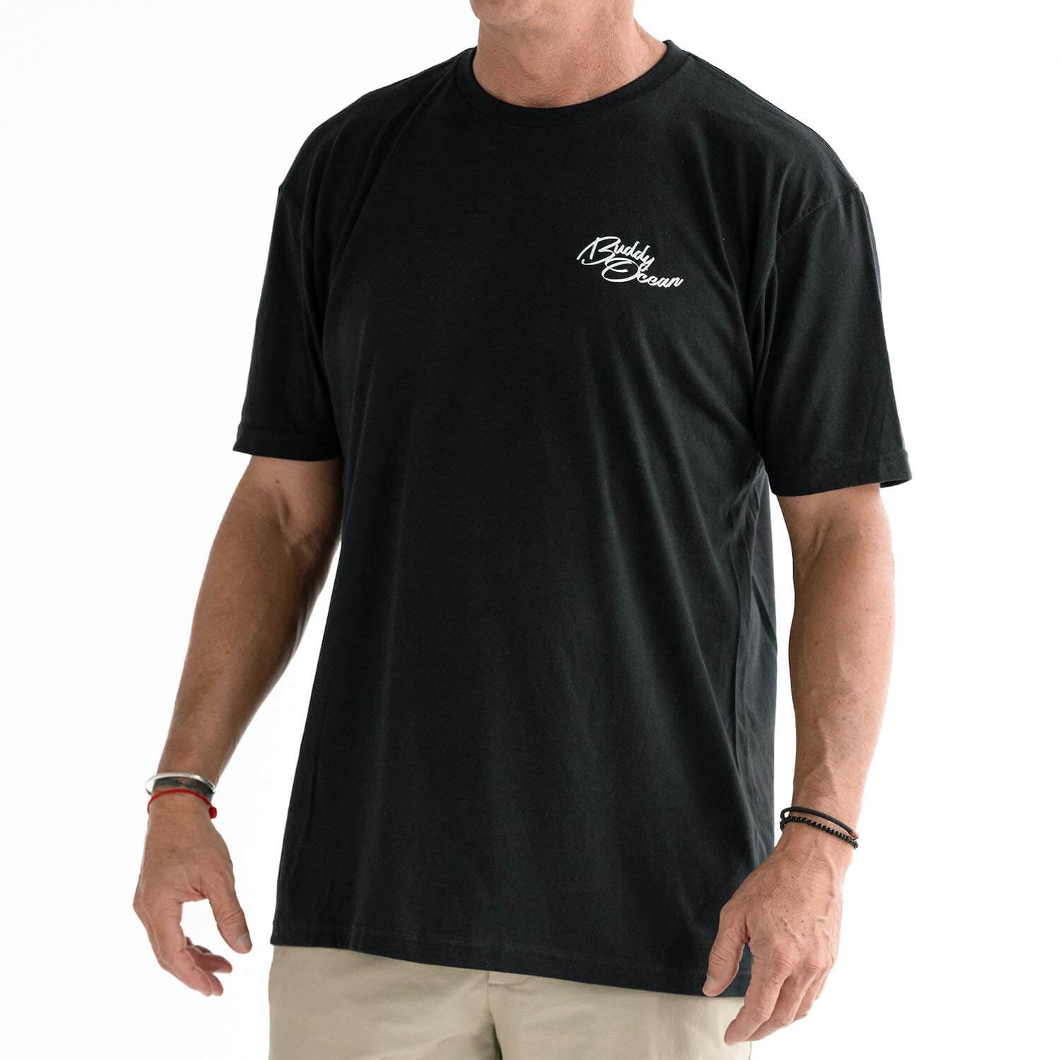 60/40 Combed ring spun cotton/poly. If you're between a large and XL, get the XL, studio Model is 6ft 185lbs wearing an XL