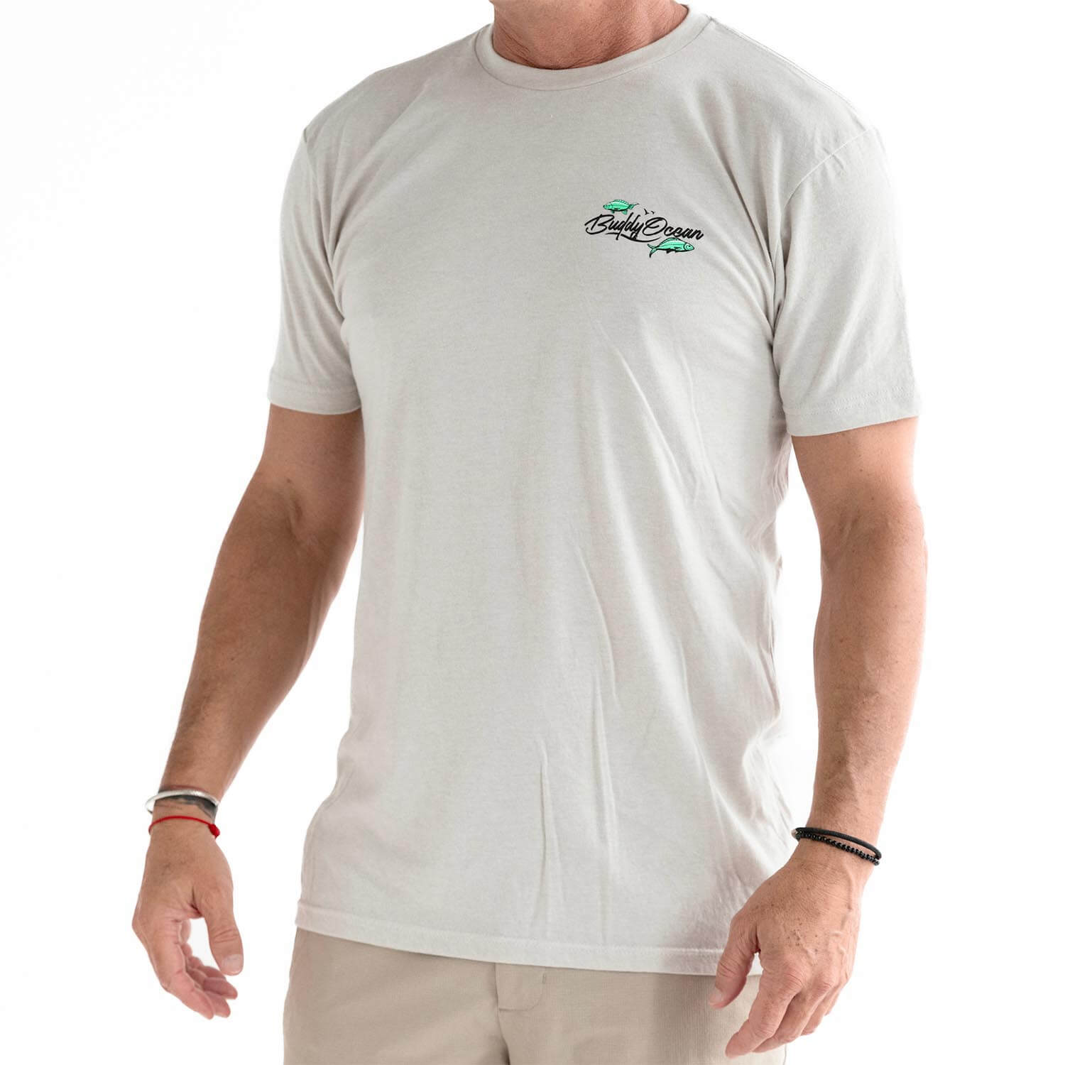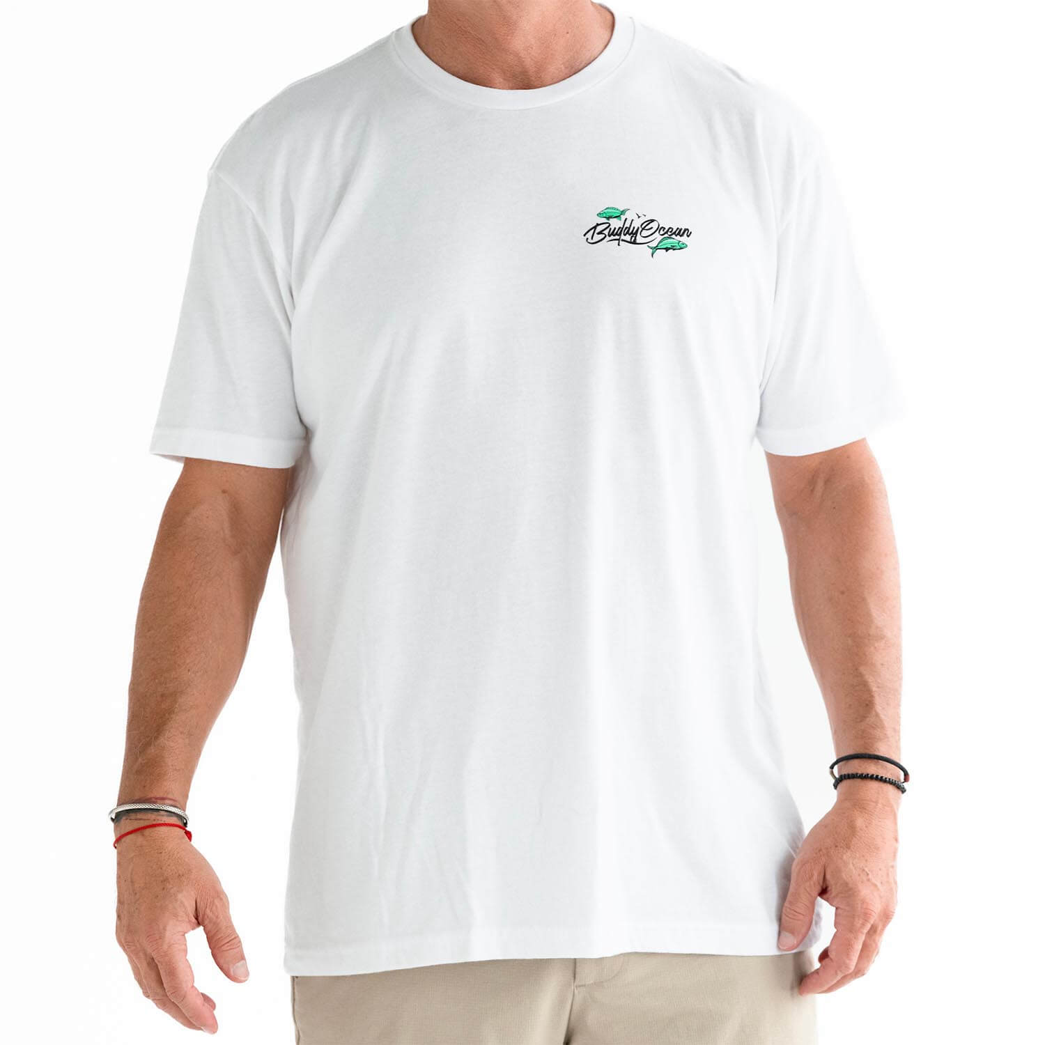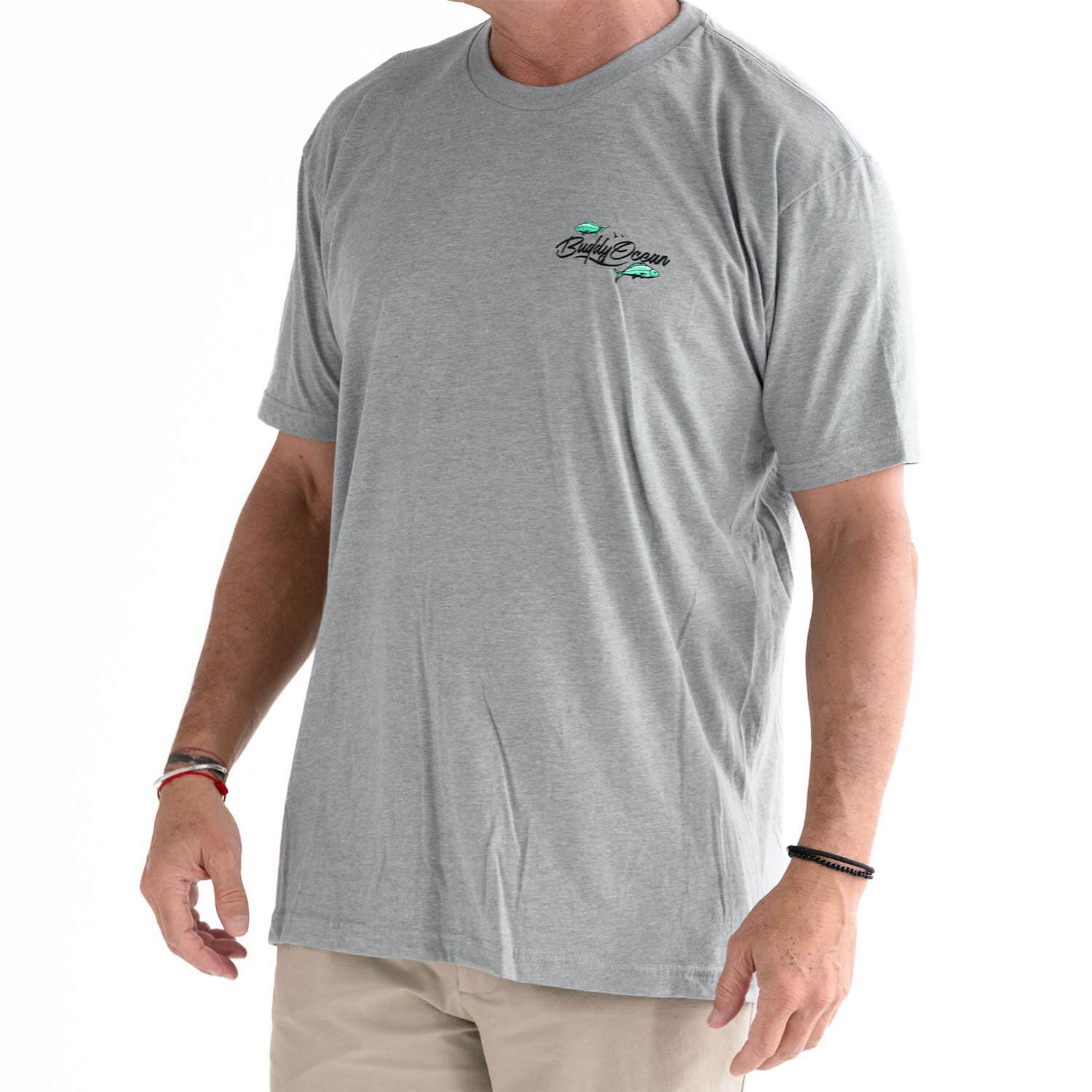 60/40 Combed ring spun cotton/poly. If you're between a large and XL, get the XL, studio Model is 6ft 185lbs wearing an XL